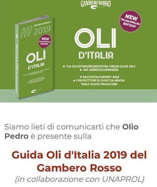 “Siamo lieti di comunicarti che Olio Pedro è presente sulla “Guida Oli d’Italia 2019 del Gambero Rosso”. Inizia così, con questa bella notizia, la mail che abbiamo ricevuto pochi giorni fa e che sancisce un importantissimo risultato per la nostra azienda. Dopo un lungo anno di lavoro, essere inseriti all’interno dell’autorevole guida del “Gambero Rosso” rappresenta per noi un motivo di grande soddisfazione.